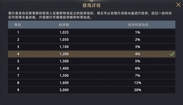 银行是来自厄斯索斯的投资人在维斯特洛设立的投资场所,领主可以在银行消耗水晶进行投资,经过一段时间后可获得回报。