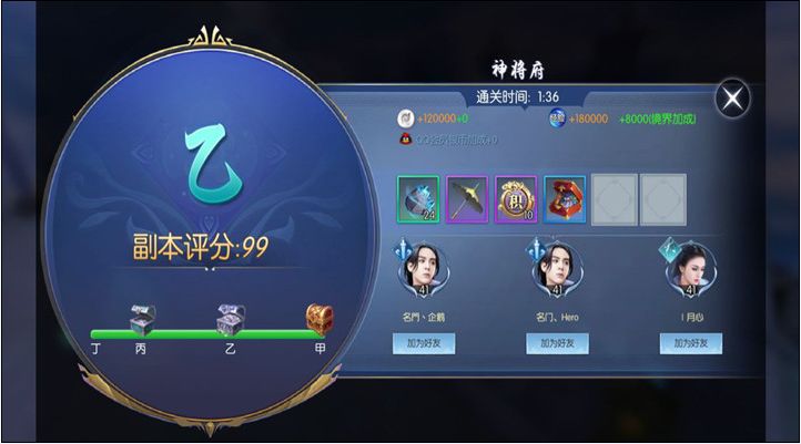 击败最终boss徐世绩即可通过副本,结算时会按照队伍通关时间等因素对本次副本进行评分,根据评分会给出本次副本的评定,评定共有甲乙丙丁四个等级,等级越高奖励获得越高,同是队伍内的玩家彼此添加好友也可以提升副本的评分值。