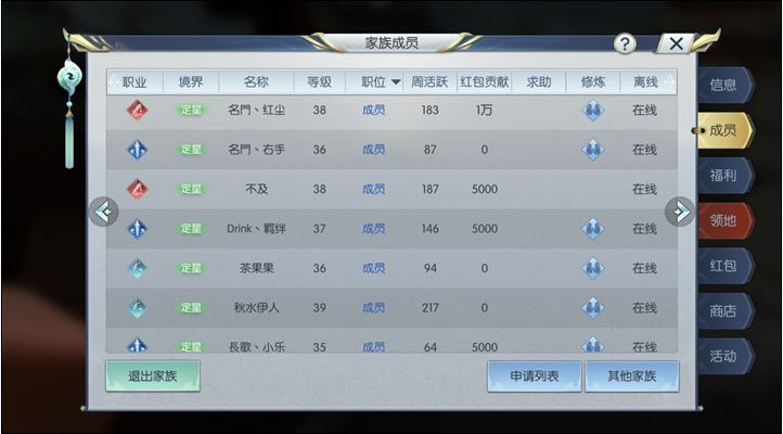 我们点击日常活动中的修炼传功按钮就会来到传功对象的选择页面,在这里我们可以看到全体家族成员的信息,在成员信息的修炼这一项可以看到传功的标志,有传功标志的家族成员我们才可以点击发送传功请求,当对方同意传功之后可以开始进行修炼传功了。