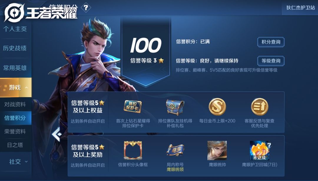 敲黑板划重点时间到!信誉等级在5星及以上的召唤师,即可喜提狄仁杰信誉系统专属皮肤奖励——鹰眼统帅!