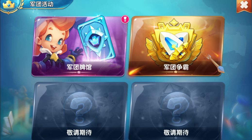 【军团活动】目前有军团牌馆和军团争霸两个活动,后续会开放更多军团活动。军团牌馆是翻牌的休闲玩法,可以获得大量军团贡献和英雄之证。军团争霸每周举行一次,是军团与军团之间的多人对抗比赛,参与军团战的军团全员可以获得英雄之证奖励,根据排名还可以获得钻石、宝物、技能书、宝物图纸、宝物铸造材料等奖励。