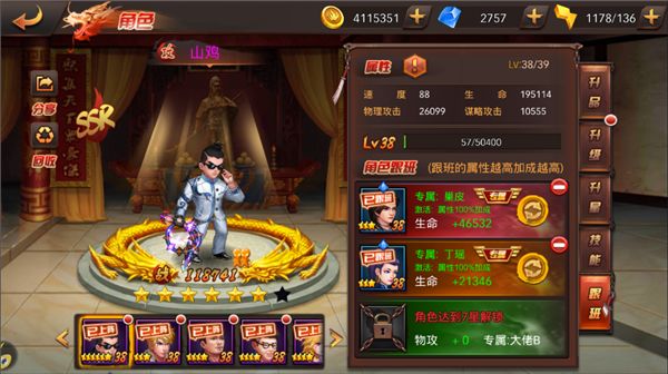 其次,跟班的培养只需培养该跟班加成的属性即可,在战斗中跟班并不会直接算在队伍总体战力上,也不会有出场攻击的场合。因此我们根据山鸡的第一个专属跟班巢皮加成生命的特性,重点培养巢皮的生命值。同样的,其他两个专属跟班也要根据跟班加成的属性重点培养,不要做多余的无用功。如大佬B,生命再高也不会算到山鸡的面板上。