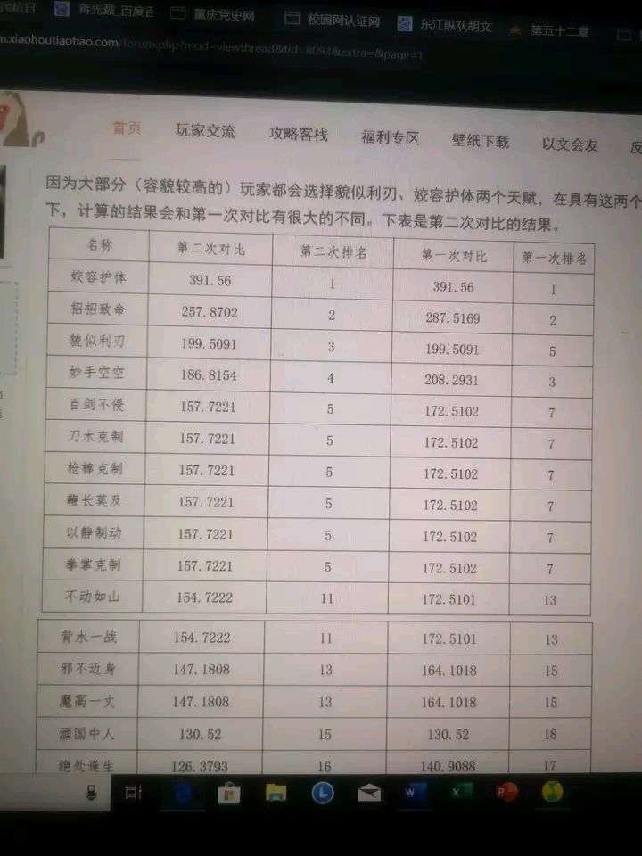 由于防护力与伤害力的计算关系,在防护力与伤害力越高的时候,其带来的收益就越小。攻击力与防御力的关系也是类似的,只是由于玩家的攻击力与防御力本身就很高,经脉天赋带来的改变不是特别大,但是对于防护力和伤害力而言(尤其时防护力),经脉天赋带来的加成远远大于玩家本身能达到的数值,因此第一次对比的时候并不是十分科学。因为大部分(容貌较高的)玩家都会选择貌似利刃、姣容护体两个天赋,在具有这两个天赋的前提下,计算的结果会和第一次对比有很大的不同。