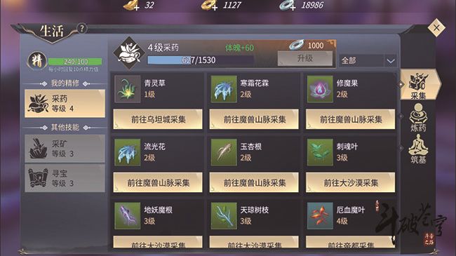 采药主要附加的属性是体魄,而且随等级的提高其属性也会相应增加。到达第4级时,体魄就增加了60点,略为可观。斗破苍穹除了斗帝之路外还有炼药师之路,炼药所需的材料绝大多数都是由采药获得的,所以四大门派都适合选择采药作为主副职,用来辅助自己的修行或者提升战斗能力。