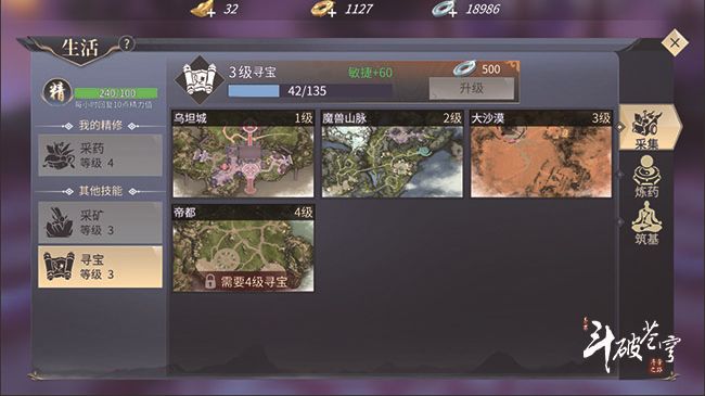 寻宝主要附加的属性是敏捷,到达第3级时,会增加60点敏捷度,对于全能型职业最为合适,例如萧族、石族。这个副职的优点主要在于后期可以赚钱,到了后期,想要提升战力必然需要打造高品质装备,想要炼成高级丹药必然需要寻宝所得的稀有材料,如此便成就了寻宝技能的生意路,赚钱了自己提功力也简单了嘛。