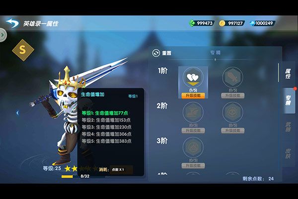 在《疯狂小分队》中,英雄能力的提升主要靠提升升级和升星,还有一个很重要的升阶专精。专精升阶可以按你的想法来进行,可以将防御类英雄打造成一个纯肉盾或输出防御并重。每升阶一级专精,可以提升英雄的不同属性。