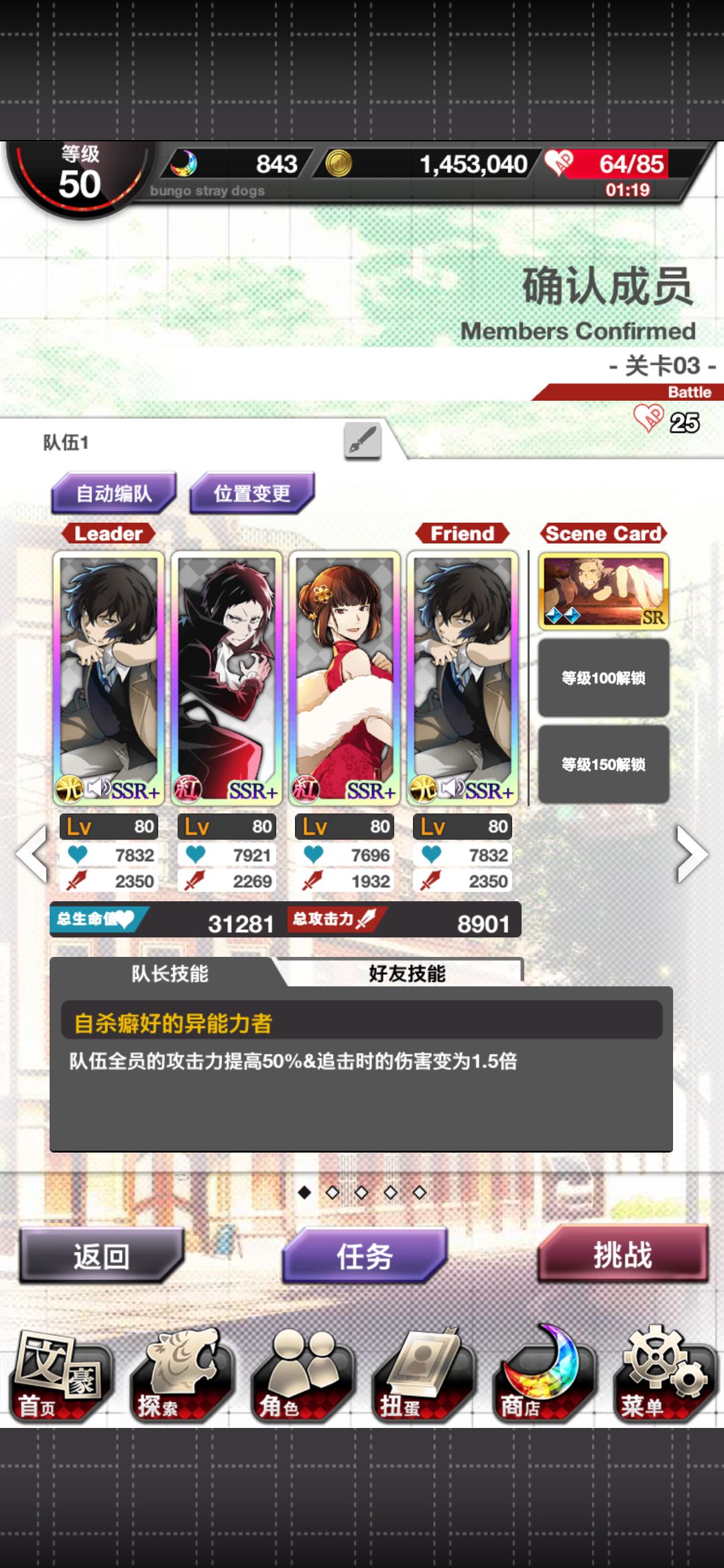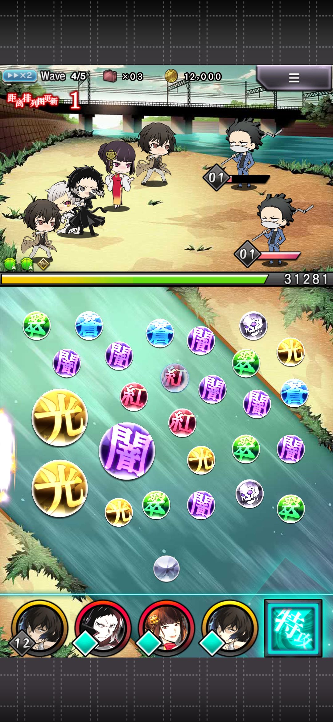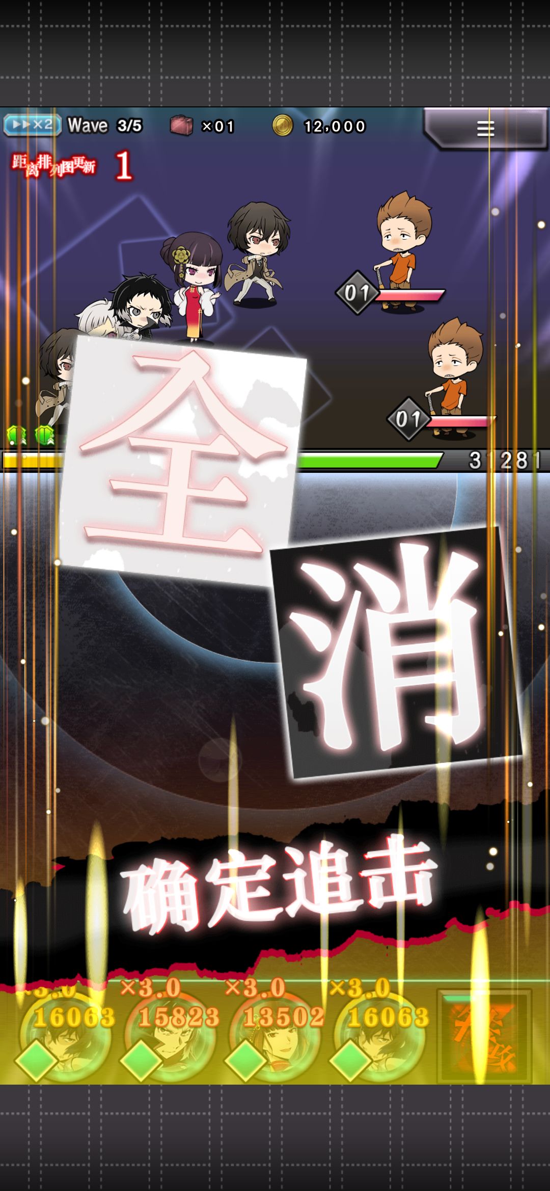 顺序不能乱,这把我是运气不错前面追击多没扣血,实际上你冲到最后一关很可能已经没有多少血了,而晶子不开技能的话芥川技能是秒不掉一个人的,最后一关a你一下估计就是半管血切忌不能提前清前面回合的怪开晶子技能,太宰技能是秒不掉后面两个怪的。必须最后用,来拉低血线。好啦,以上就是我对场景本关卡的攻略秘籍。如果你有其他的清奇的思路,欢迎在下方评论。
