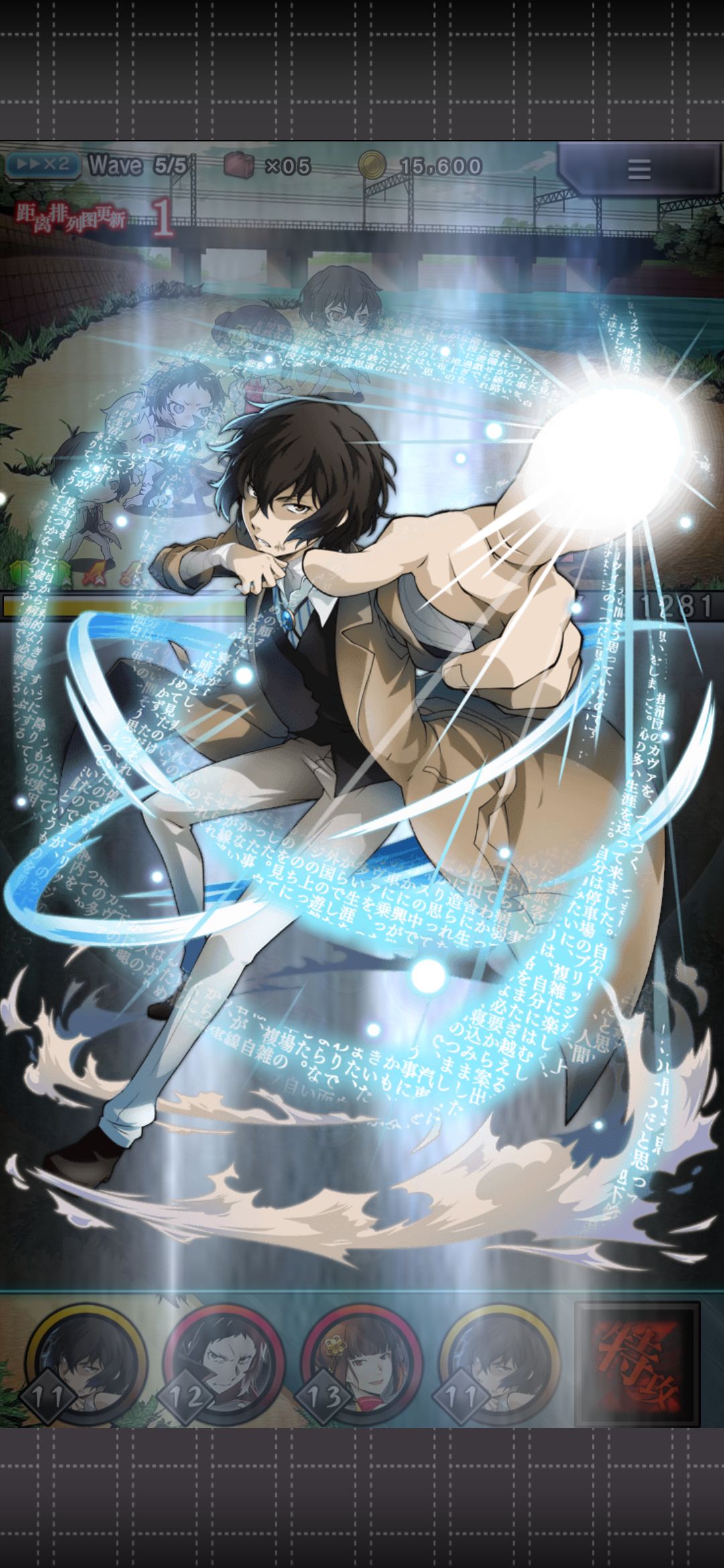 最后一回合先开晶子技能追击芥川技能可秒掉一个人,最后再开太宰技能敌人还剩丝血,在清清球结束。