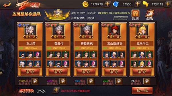 夺宝即是通过与拥有碎片的玩家PVP,胜利后即可获得该玩家的一个武器碎片。进行夺宝前可以选择不同掉落几率的对手进行抢夺,对手实力越高,掉落几率越大;在抢夺成功但没有获得碎片的情况下,将会使用金钱补偿。夺宝夺宝每天只有5次的机会,每天凌晨12点清空并重置次数。另外,如果自己的武器碎片没被抢夺一次将可获得5000金币。