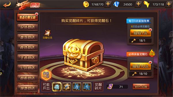 觉醒石的获取途径主要是通过开启觉醒石宝箱,觉醒石宝箱位于游戏主界面中的商店页面。每开启一个觉醒宝箱需要用到一条觉醒钥匙,或者使用钻石开启,而觉醒钥匙每日在线30分钟就能获得一个。开启觉醒宝箱就有机会获得觉醒石。另外,每开启十个宝箱必定获得一个觉醒石。