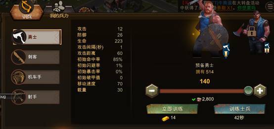 5、共四个兵种:勇士、刺客、机车手、射手,可以同时征兵。