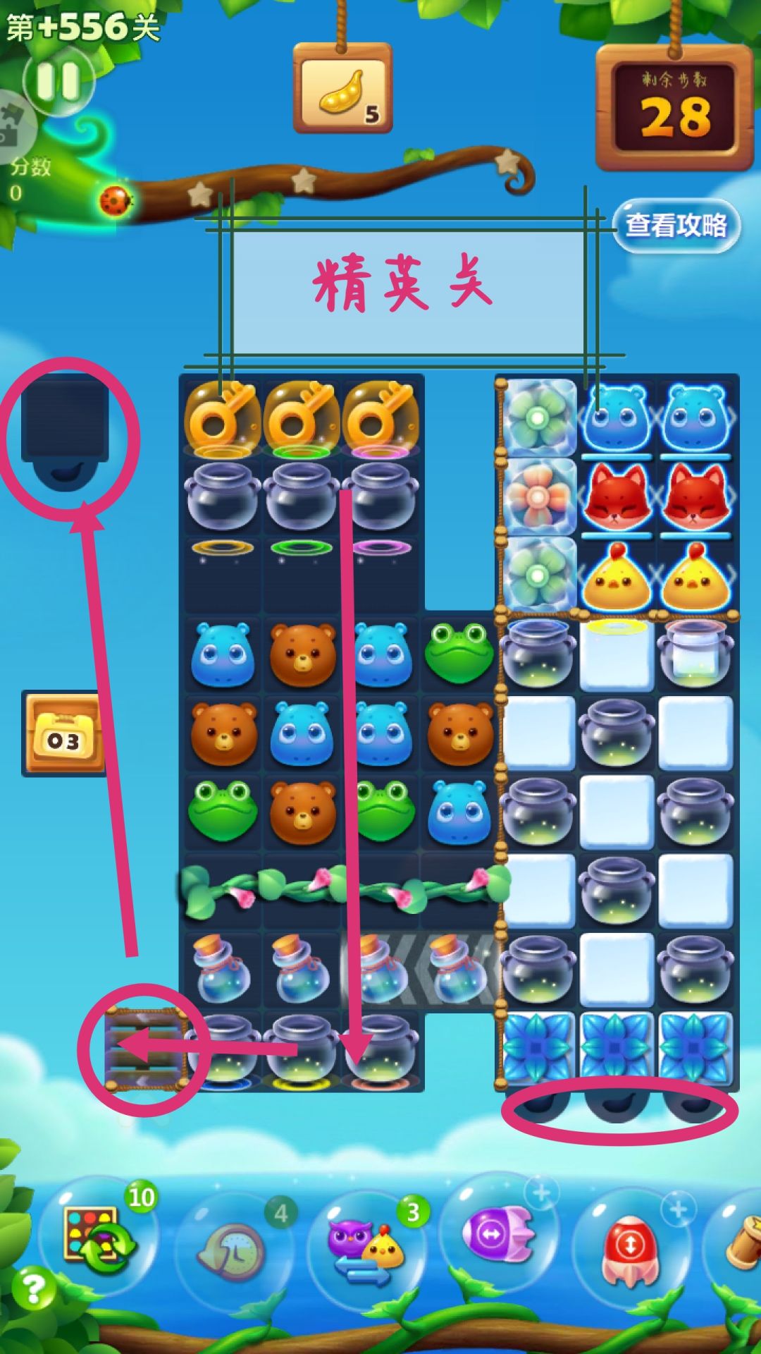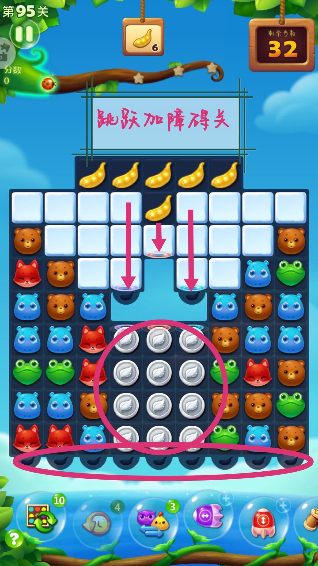 ☞1.普通关卡,这种关卡就是最基础的关卡了,打通冰块,消除动物,就可以将豆荚送进洞了,基本上只要剩余步数够多,现在步数分数调高了,加上补星瓶的分数加成,三星很轻松(需要注意的是,看准豆荚下方的洞,尽量消除让其落下那一条线上的动物)。