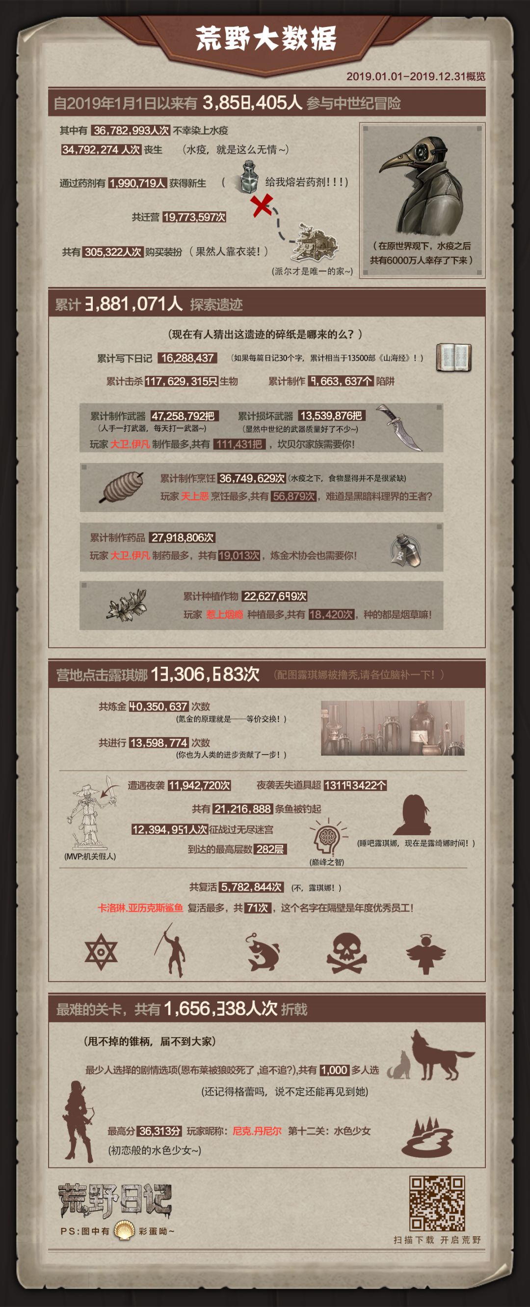 回望各位在《荒野日记》度过这一年中,留下很多值得被记录的回忆!每一个数字都标示着玩家在荒岛中求生的不易。在这一年中,成千上万的你们经过不懈探索发现了这片荒野的各个秘密,走过了这片荒野的每个角落,看到了这个世界的每个细节!感谢一直支持我们的你们!正是因为有你们的存在才使《荒野日记》变得更加完善!