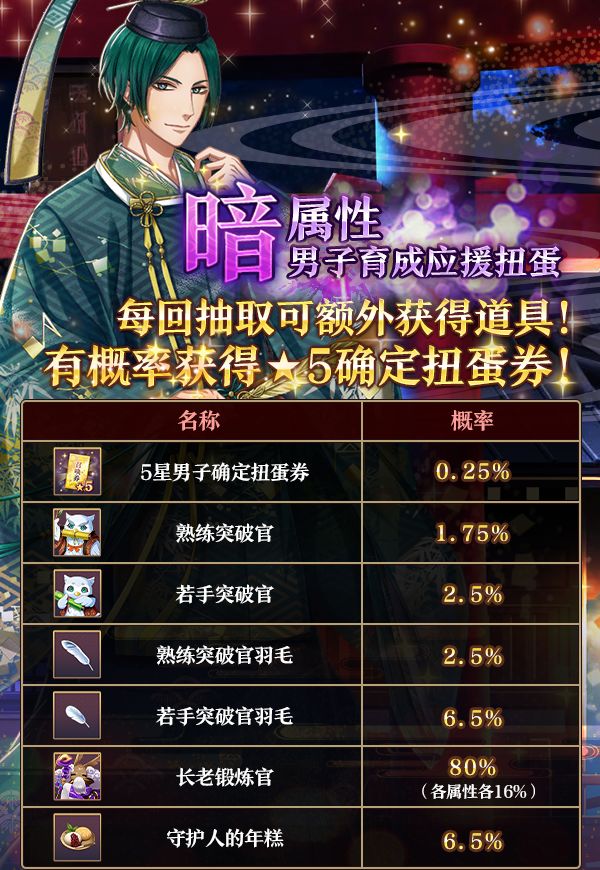 ※ 暗属性扭蛋池出现男子和概率及抽取额外获得奖励的概率,请在召唤-活动扭蛋界面点击图片查看。