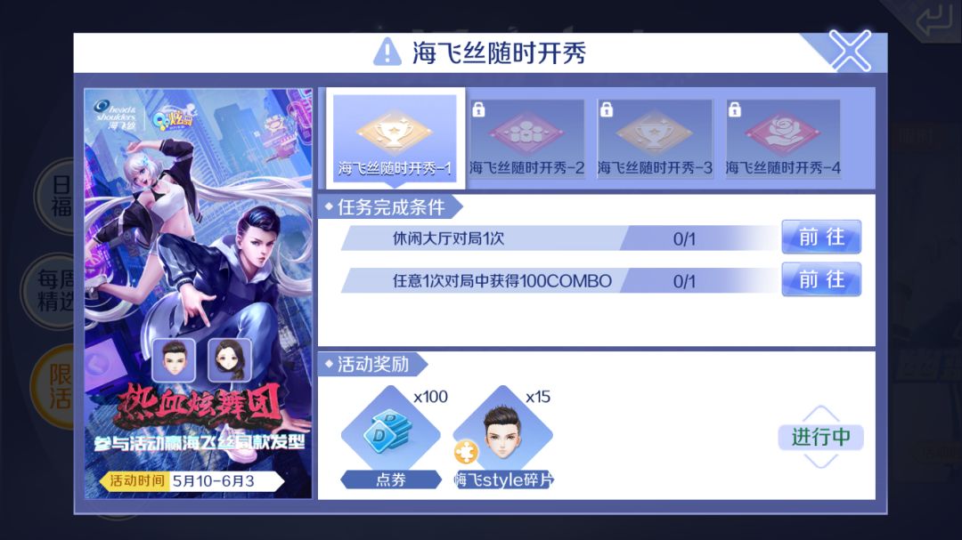 任务完成条件:①休闲大厅对局1次②任意1次对局中获得100Combo。