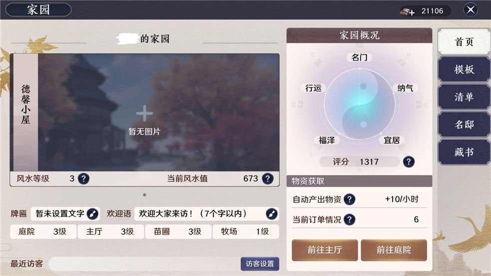 在此我们可以看到目前家园的照片介绍、风水等级、风水值、牌匾、欢迎语,以及目前庭院、主厅、苗圃、牧场的等级。这里像是一张家园的名片,将家园情况介绍的清清楚楚。我们可以看到家园的最近访客以及通过访客设置,设置家园进入权限、普通家居交互权限以及功能家具交互权限。家园概况中家园评分为名门、纳气、福泽、宜居、行运五个维度的评分总和,以及目前的物资获取情况: