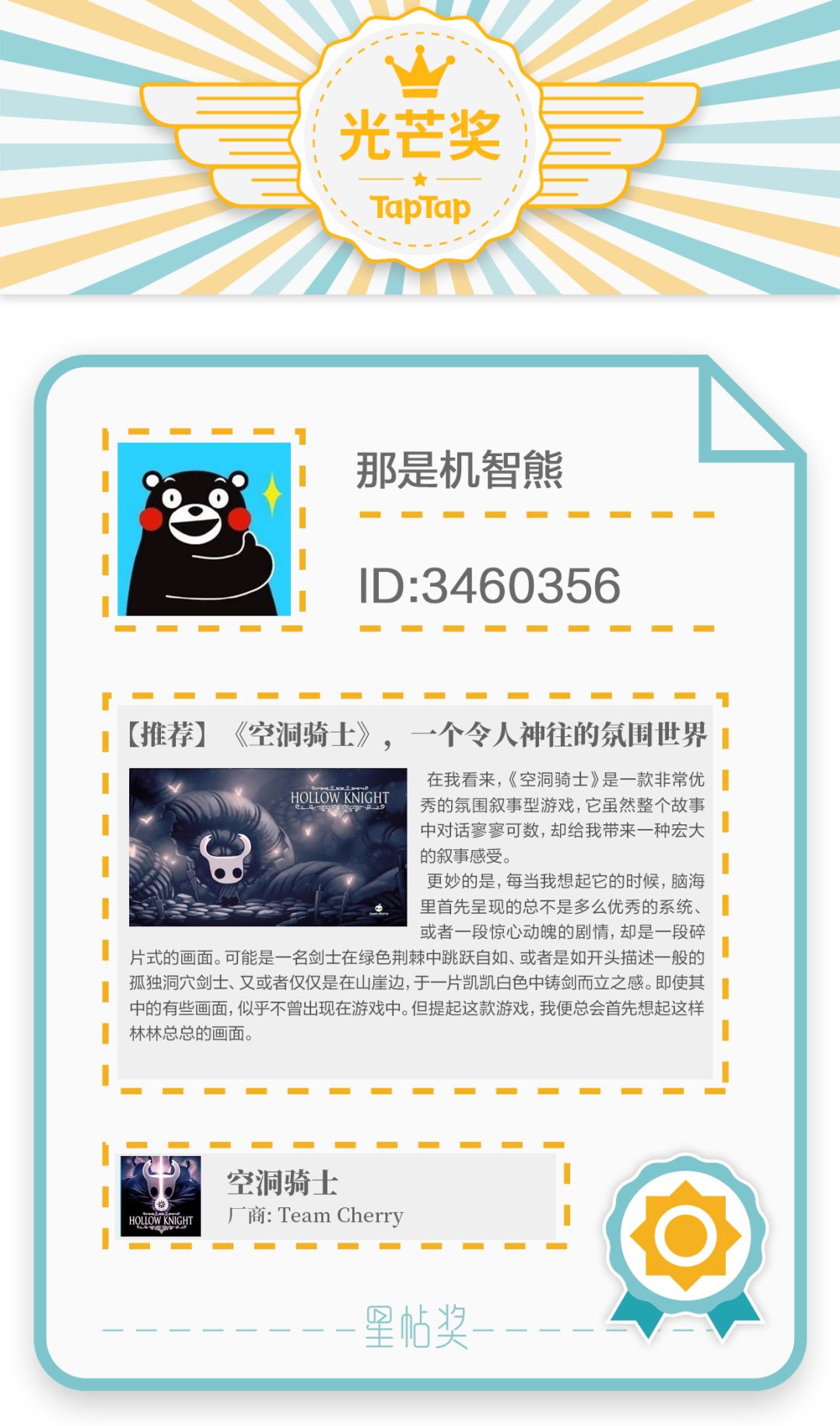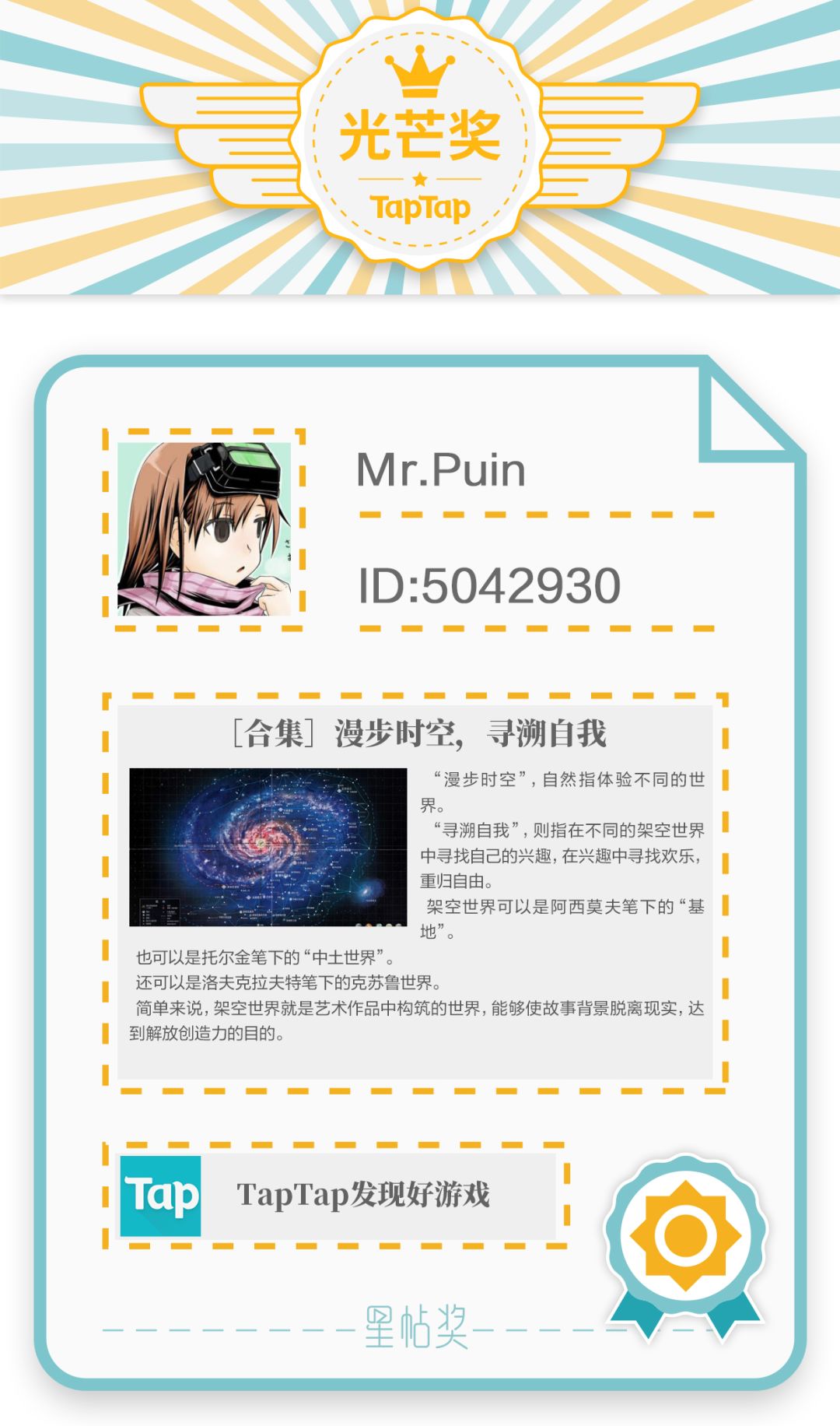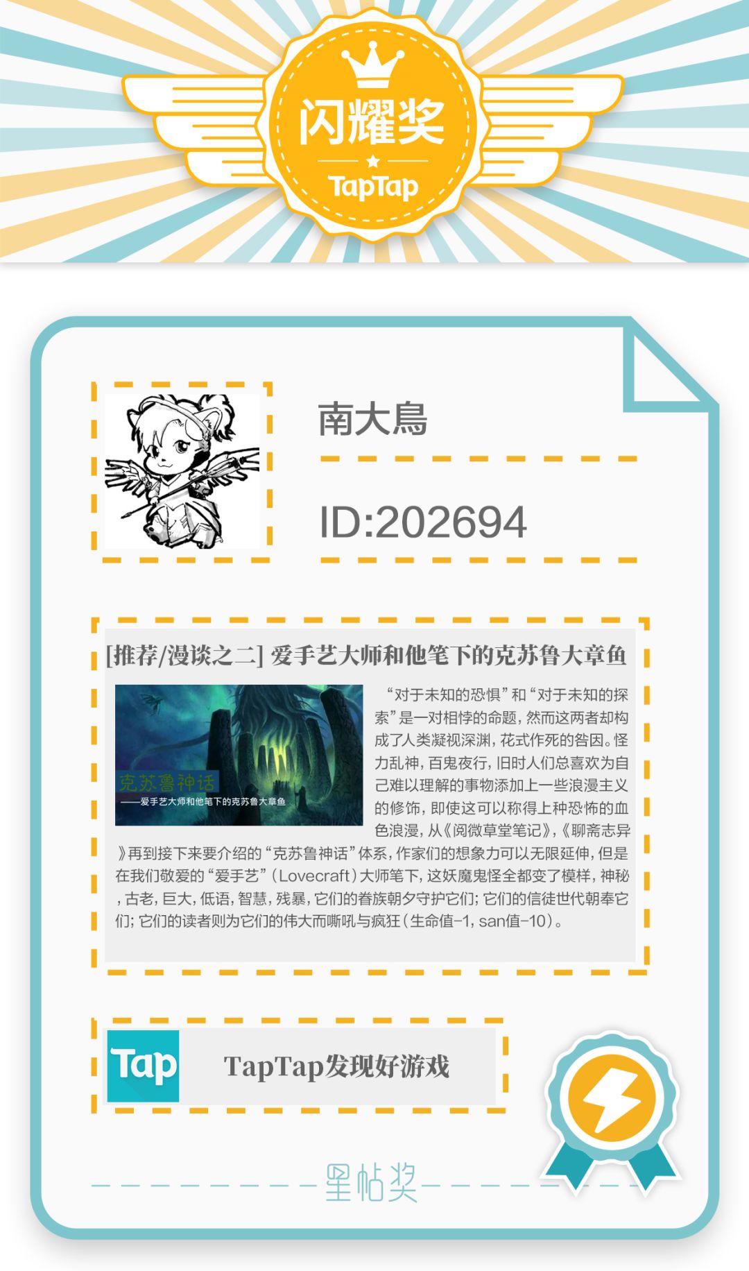「星帖奖」栏目是为更好地挖掘 TapTap 游戏爱好者的优质内容,提升 UGC 影响力,鼓励优秀内容贡献者而创。