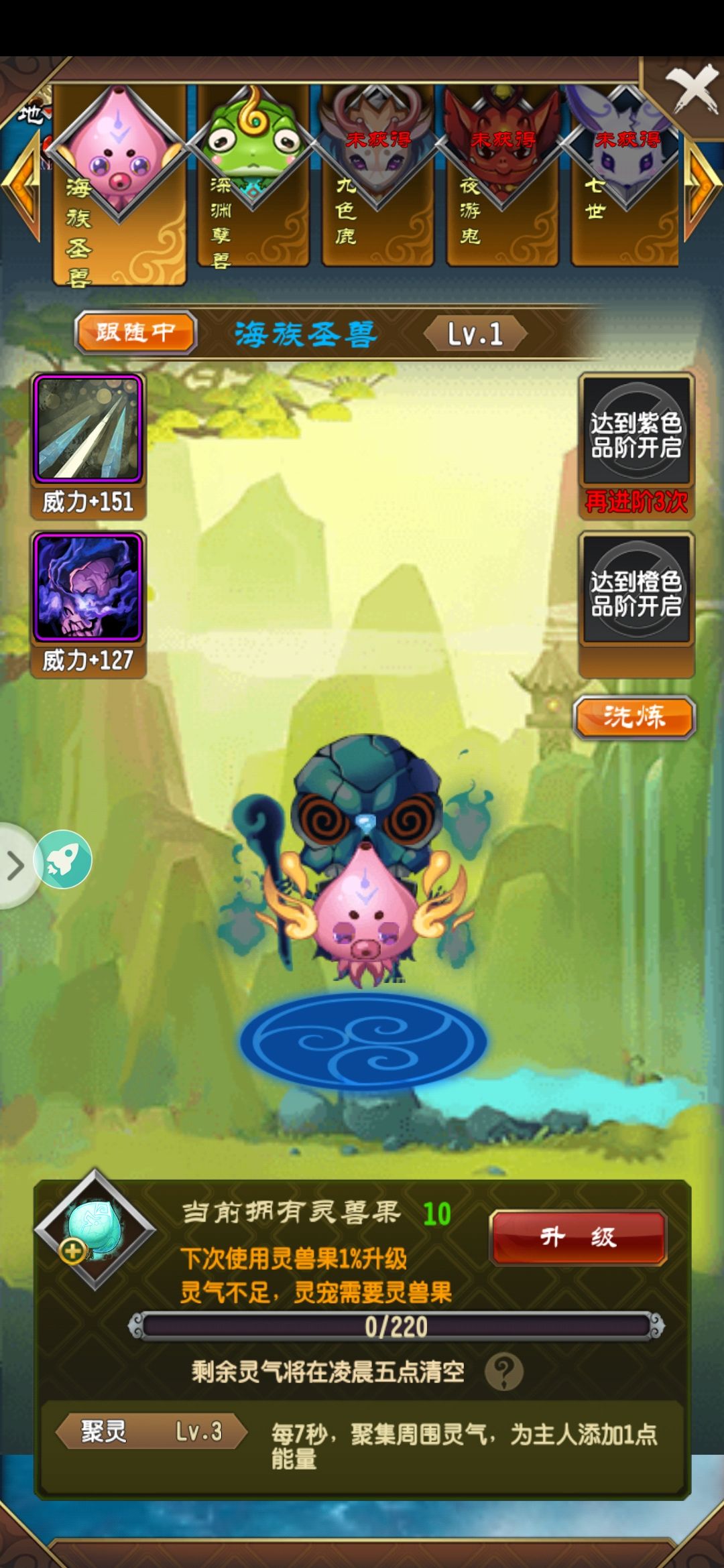 紫 聚灵6级 每5.5秒,聚集周围灵气,为主人添加1点能量