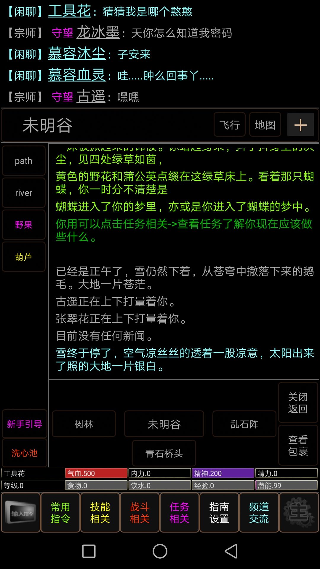 流程和给葫芦一样,点武师,点给予,然后给予刚剑和烧刀子接着点武师,点击查看技能然后点牌子,点学习技能。之后出新手村后学习技能是点击查看技能,点击你要学习的技能,点击向xx请教xx到这里想玩太乙流的就不用看下去了,进群找我家岚岚的攻略就行。纯萌新可以接着看。一直向下走,走到缓坡,点path,然后趴下去,可以回到出生地。然后激发武功。点击下方的技能,点击查看技能