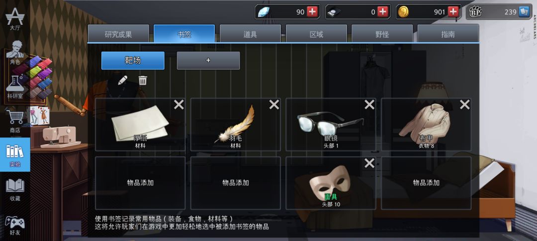 摸厚纸x2,眼镜x1(装备上),羽毛x1或0(不必强求,一会还有地方可以摸到,有的话就合成面具),布甲x1(装备上)