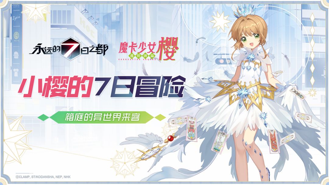 本次《永远的7日之都》将与《魔卡少女樱CLEAR CARD篇》联动。如今强大的异界扰动再次降临,这一次,击败游荡在城市中的怪物,与小樱相遇,一起恢复交界都市的和平吧!