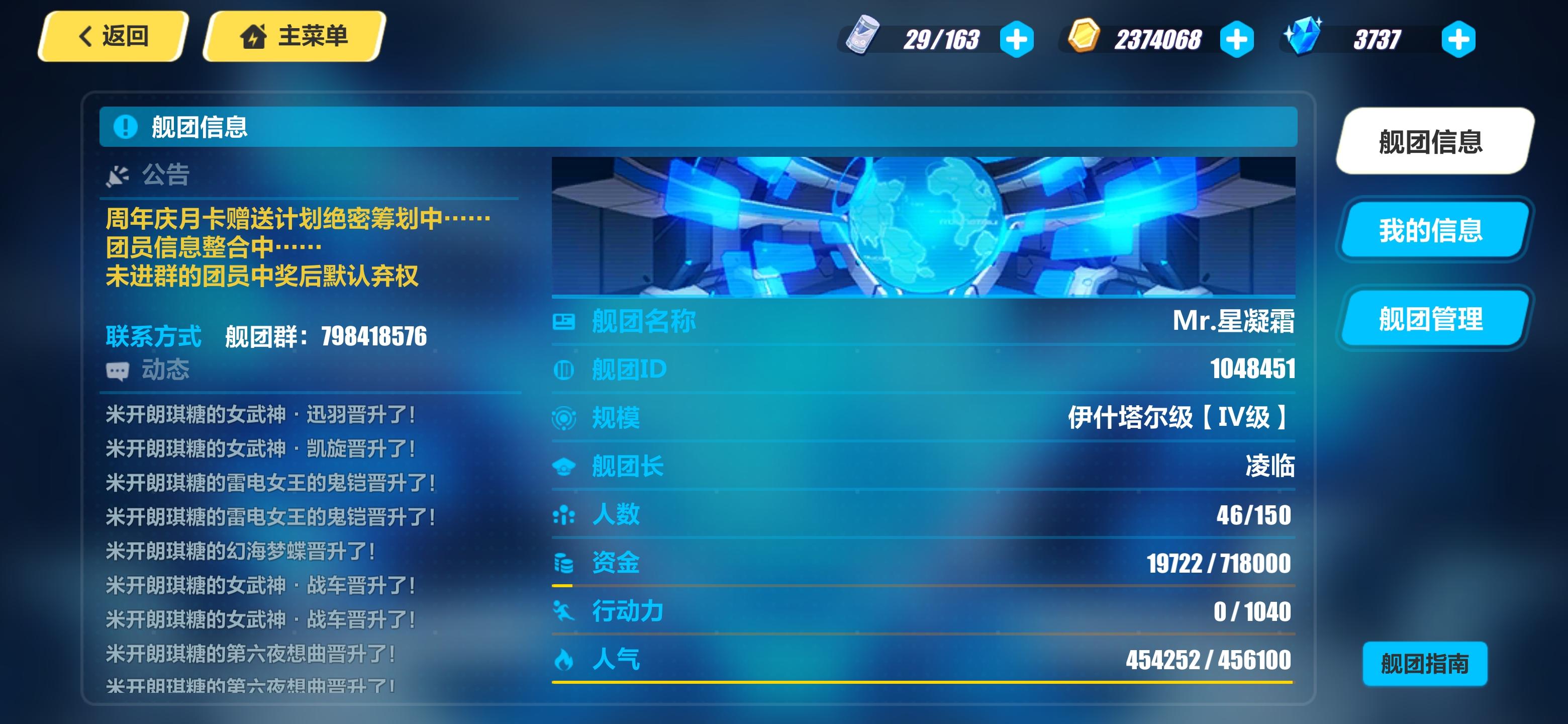 又是一个新版本呢,Mr.星凝霜终于升到伊什塔尔级啦,舰团人员数量急需大规模扩充✧٩(ˊωˋ*)و✧