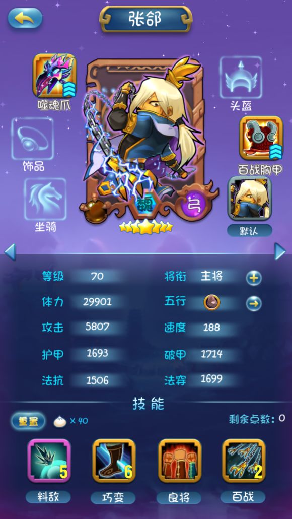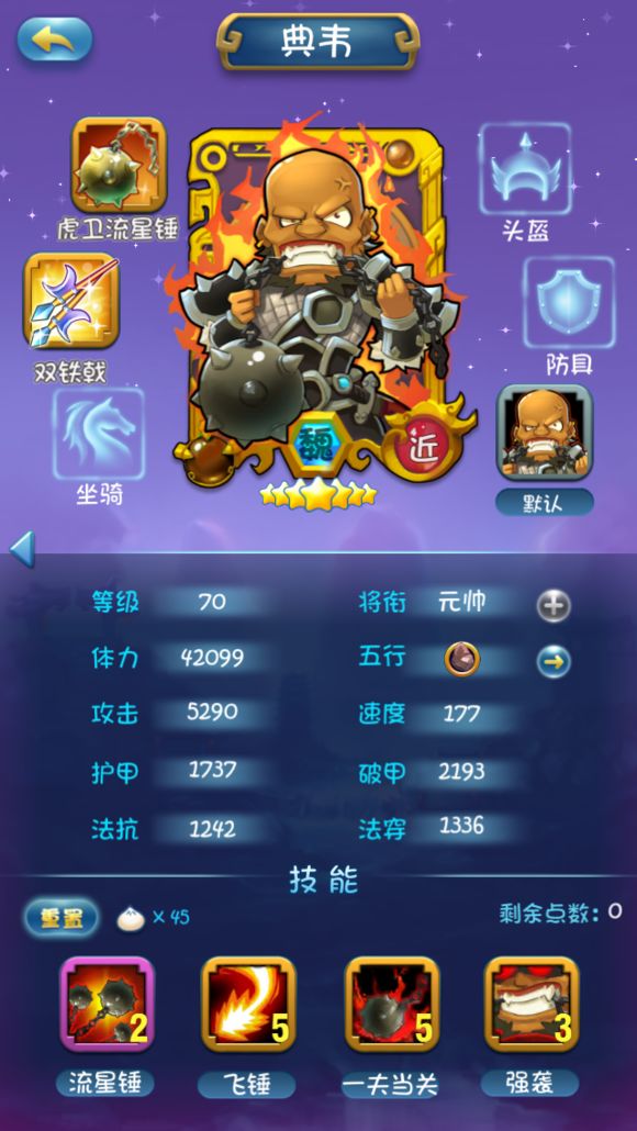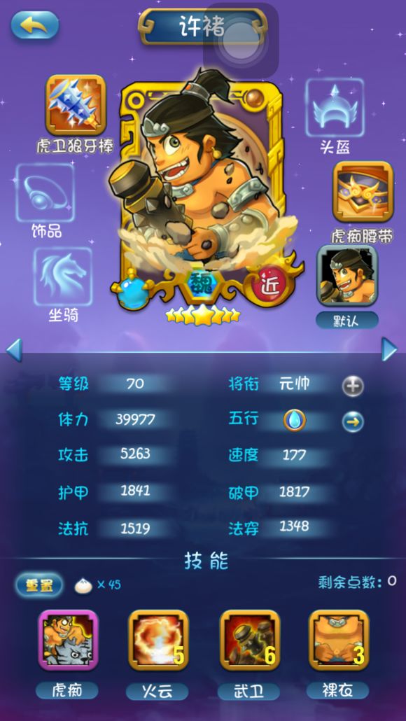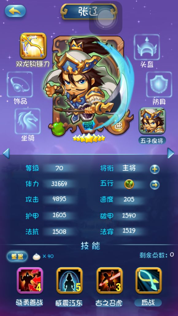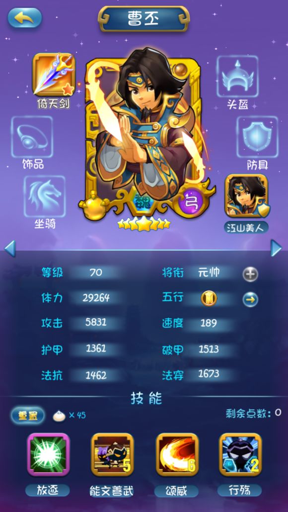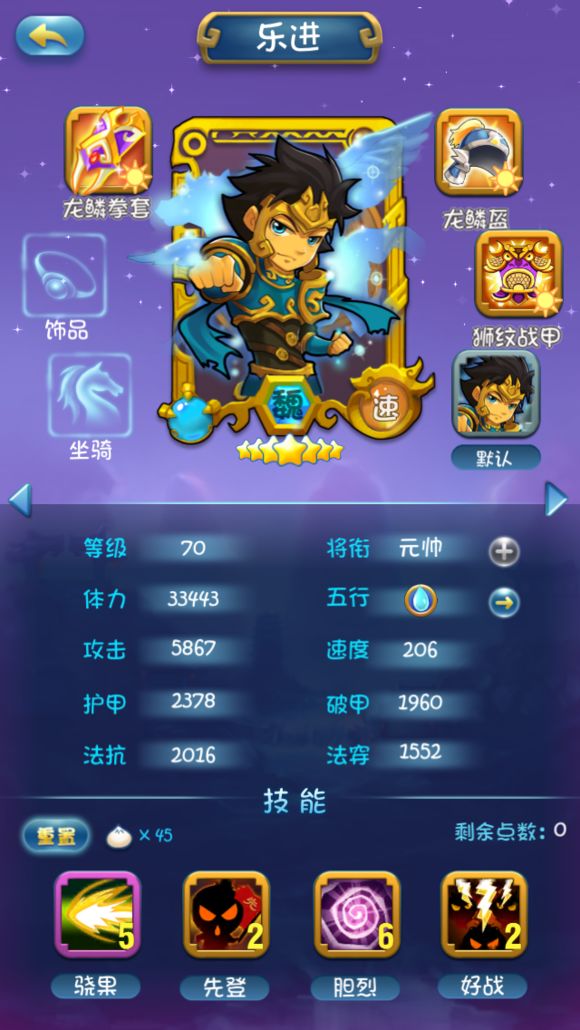 因为组合技所以1技能不点,2技能类似马超的冲锋很给力,后面因为站前排所以把3技能点满4技能少点增加存活率。