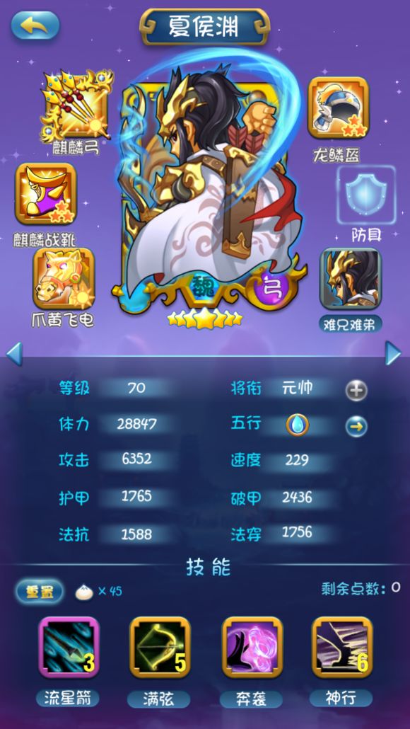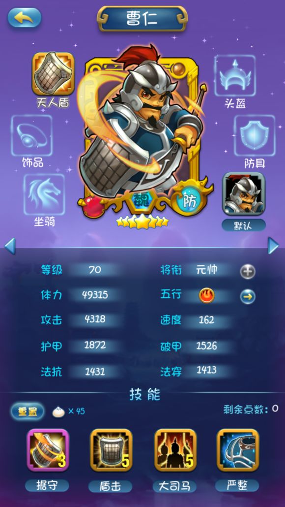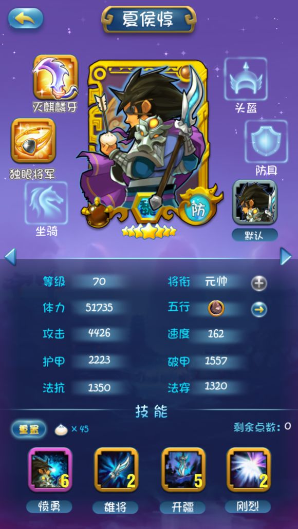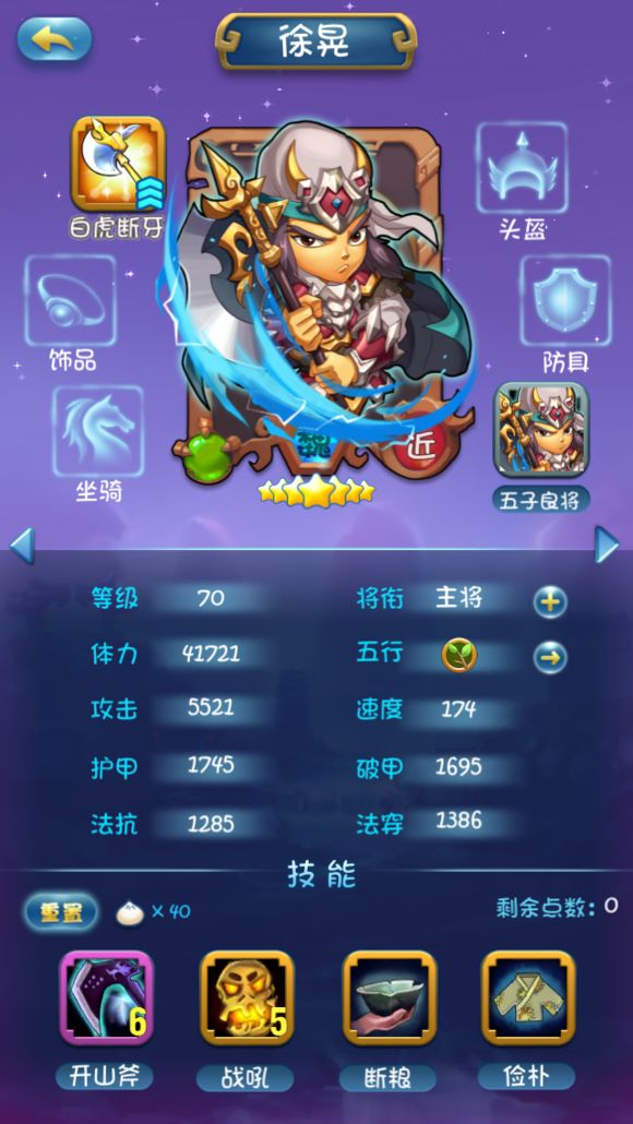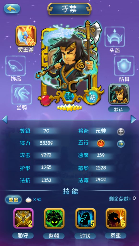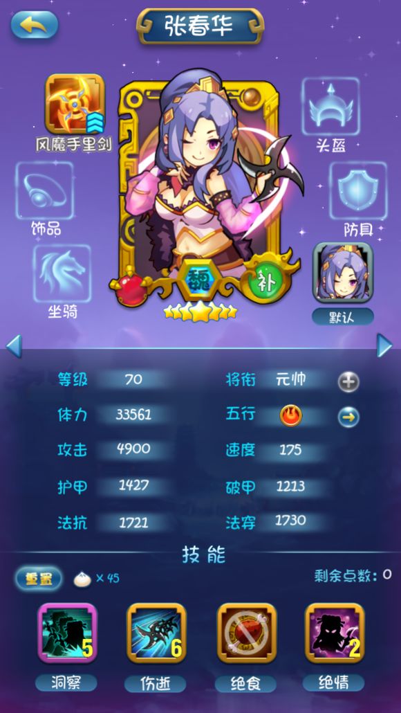 因为组合技所以1技能不点,2技能类似马超的冲锋很给力,后面因为站前排所以把3技能点满4技能少点增加存活率。