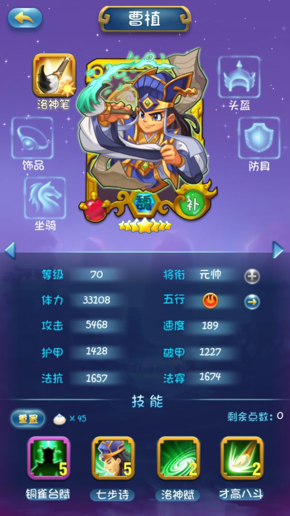 我反正是从来没用过他,12加点是因为我从来不加debuff类的技能,有用过曹植并且有体会的大神欢迎来分享经验哈。