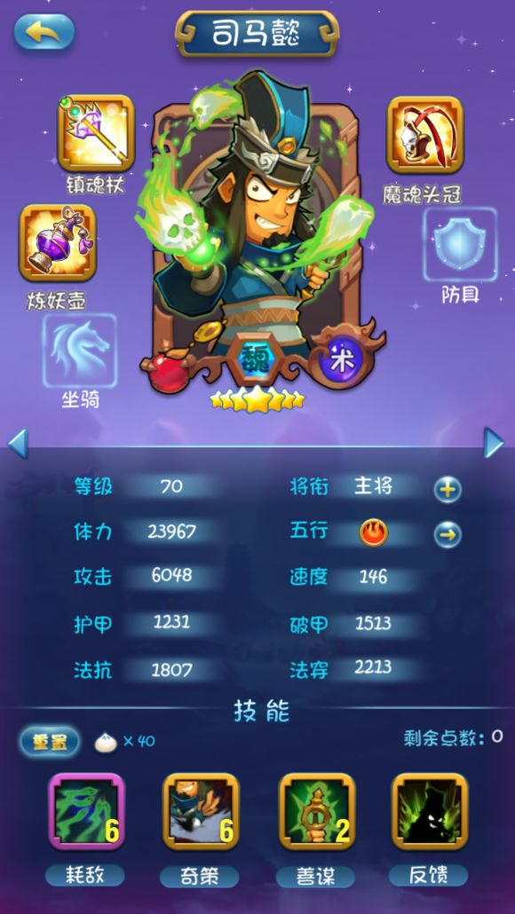 绝食本来是个不错的技能,不过不论从范围还是效果上来说都不俗司马懿,还要捎带上自己,而且魏国也没有会连环的人,所以作用不大。绝对伤害有就行了,不需要多,所以一般情况下只要12技能加满就行了。