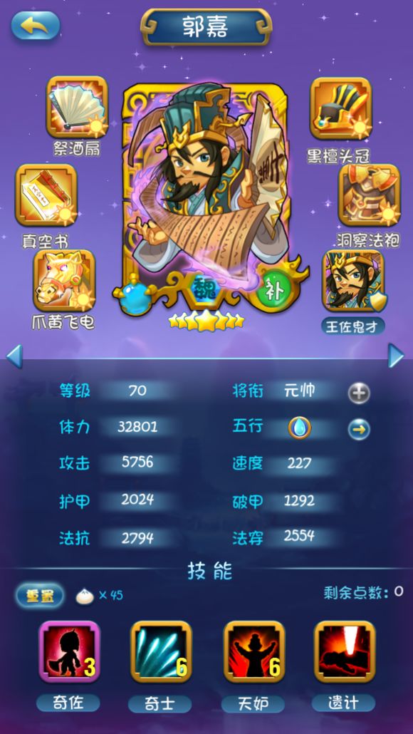 郭嘉,单三2神将之一,奇士+天妒闯遍天下,是一个对方人越多自己的奶量越足的奇人。虽然是个补将,但自身防御力不错,带个真空书能够稳坐任何阵型的副T,为后排空出一个DPS的位子,配上奶爸华佗,或是在魏国故事中不论是搭配张春华还是荀彧的王佐之才,都能够把所有人的血线看的稳稳的。