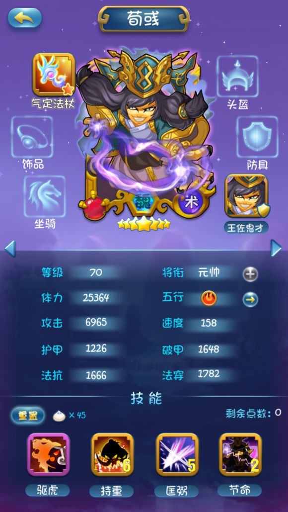 如果有铃铛的话2技能其实没什么用,基本上不会有机会荀彧还能和另一个术将一上场的,所以如果有铃铛的话就加34,没铃铛的话最好每次前进之前要看一下对方阵型,调整荀彧的位置。
