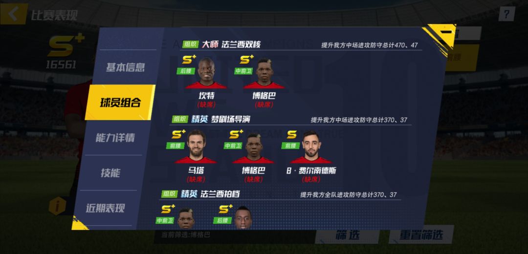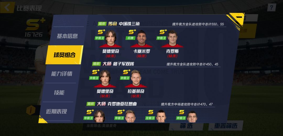 前期按照系统提示过剧情,球探开启以后会搜索到一名优质的中场球员(莫德里奇or博格巴),这两名球员都是很强的中场球员,实力相当而且没有高低之分,非要加个排名的话,就是球员组合这方面莫德里奇优于博格巴,出了谁都可以一直培养,只不过莫德里奇更好的搭配一些球员可以尽快拥有球员组合的战力加成。(附上莫德里奇和博格巴的球员组合图)