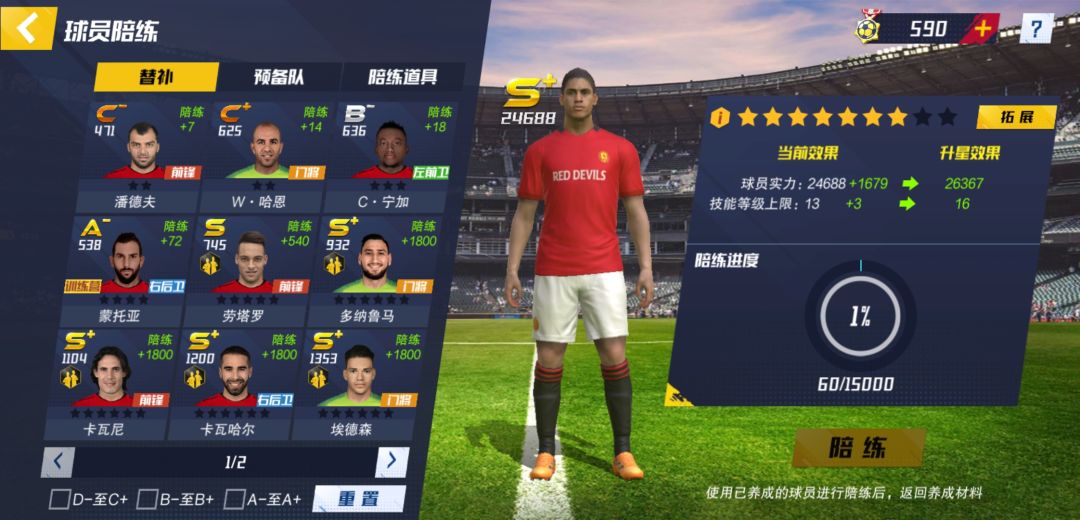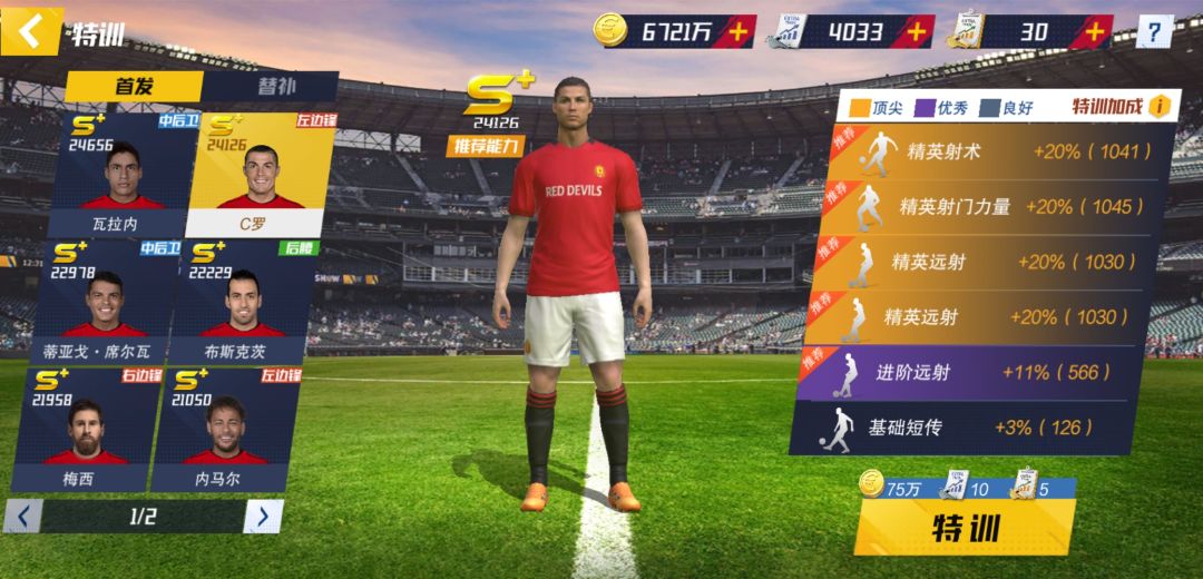 游戏里培养球员的方式各式各样,有球员等级突破、球员训练、球员培养、球员精训、球员升星、球员特训几种方式。前三种比较简单,跟传统卡牌类手游相差无几,在此不展开说明,补充一点:优先刷高级材料给阿圭罗内马尔博格巴这类顶级球星使用,因为这是球队的建队基石,可以一直用到游戏后期,刷完高级材料再用体力刷低级材料。
