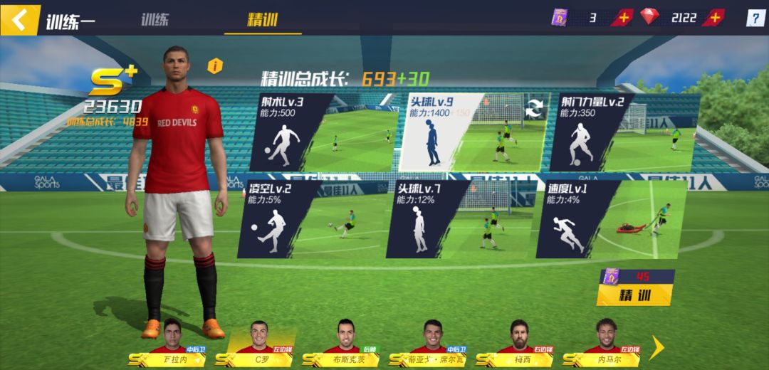 如何去选择这些精训项目最好呢,首先要结合球员自身的技能去看,就以C罗为例,C罗自带技能头球高手以及远射高手,那精训项目就以这两项为主,如果C罗踢的前锋,那么推荐主加头球;如果C罗踢的边锋,那么推荐加远射。中场与后卫球员同理,如果自带的是传球技能,推荐加视野弧线,如果自带抢断技能,推荐加抢断拦截盯人。精训总共有6项,是需要建立在有一定训练基础上才可以解锁更多的精训项目,所以在精训的同时不要忘记了球员正常训练。