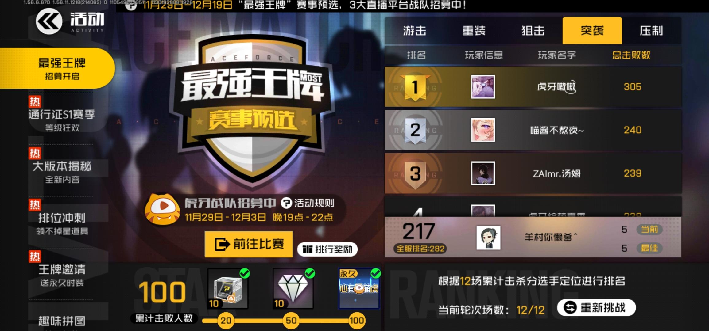我11把杀了196个,最后一把我的爆风让人给抢了,我开局先用时空打了两个头,然后马上换了突袭选手打了5个,结束后我就12把打完了,最终游击定位196,排在22名,难受啊,稳上两百多的,一把被抢直接凉凉,等于是最后一把给突袭了。我真的觉得应该每个定位12把,而不是总共12把,这个要冲榜的,谁会打了几把游击又跑去打突袭?那这样岂不是两边的人头都不够别人12把打的,所以说这个规则是真没定好,每个定位都有12把才好啊!!!
