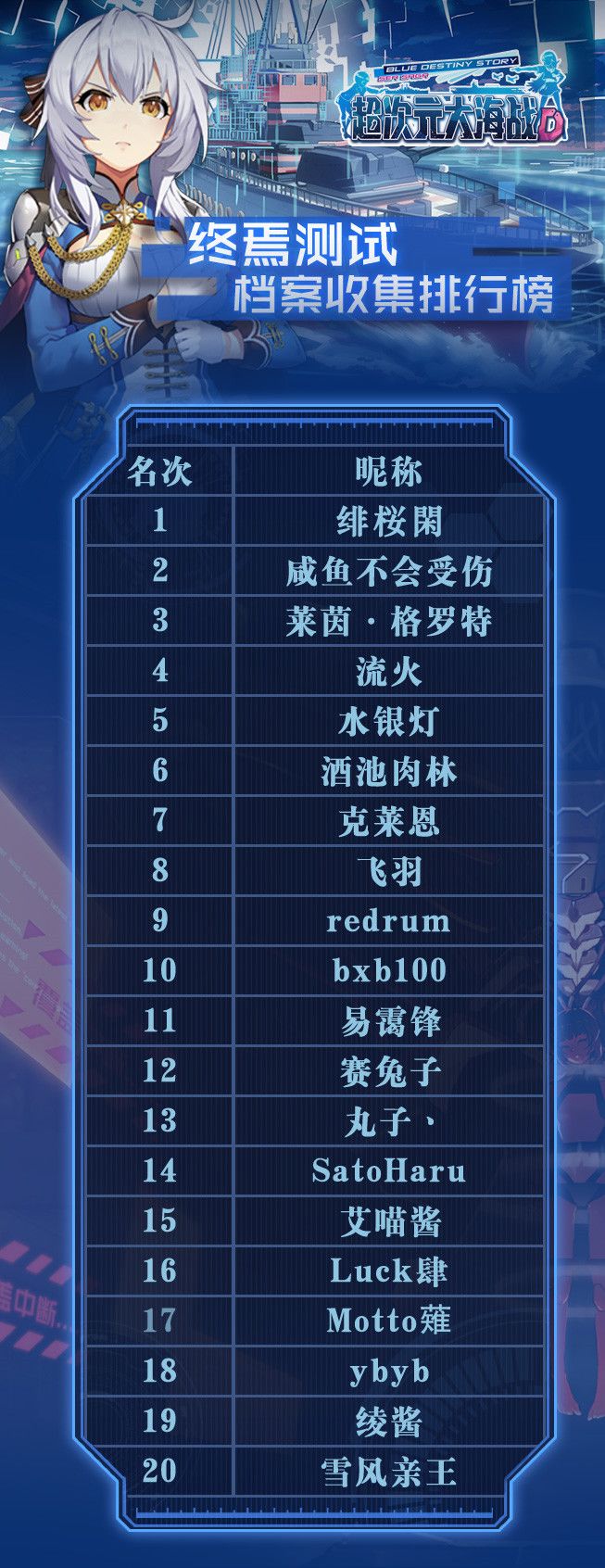 下面就由指挥部为大家带来此次测试中,玛希服务器的档案收集排行榜TOP20的名单!