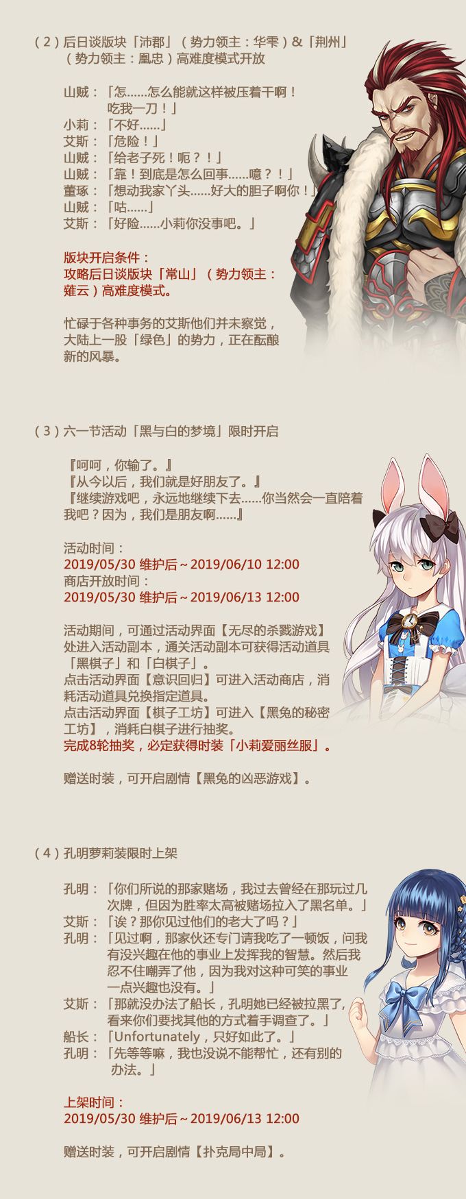 本次更新将会开放战姬洵优以及后日谈版块「沛郡」(势力领主:华雫)&「荆州」(势力领主:凰忠)的高难度模式;届时将限时开启六一节活动「黑与白的梦境」;期待已久的孔明萝莉装也将限时上架哦,千万别错过喽!