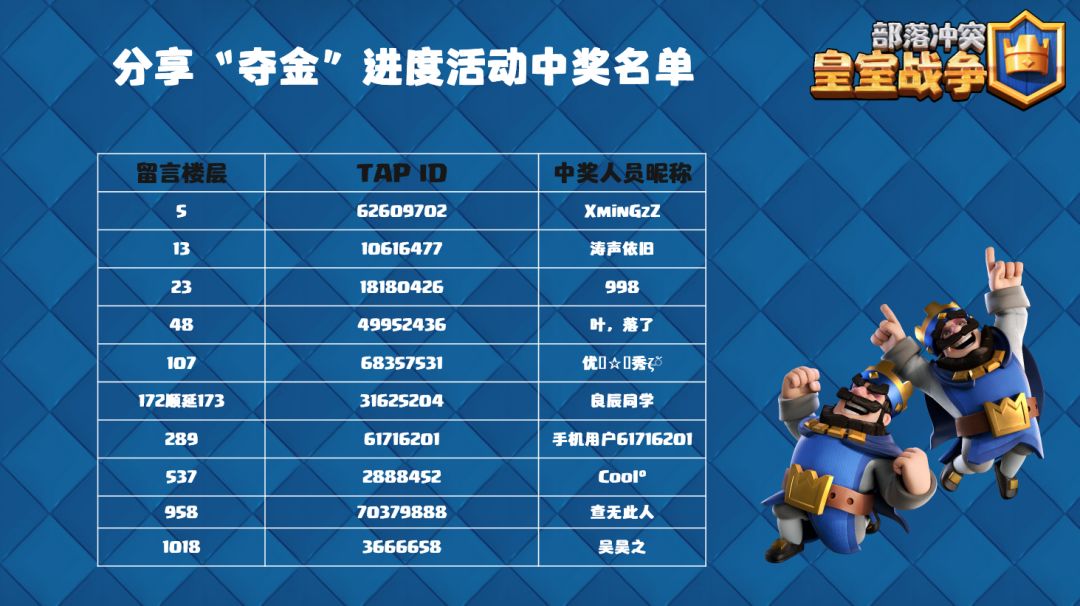 【获奖信息】分享“夺金”进度活动中奖名单 | TapTap 部落冲突:皇室战争社区 - 活动福利 | TapTap 发现好游戏
