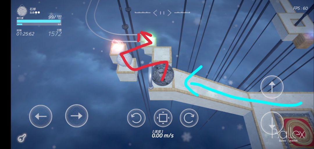 和刚才木球一样的路线,石球从蓝线坡冲上来会比较困难,助跑距离需要长一点,然后最好按照红色路线走(这一段会比较自闭)