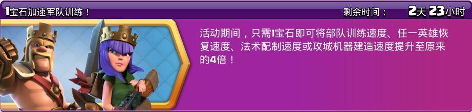 咳咳,言归正传,“1宝石加速军队训练”就是游戏内活动期间训练军队(平时30宝石1小时)、药水(平时10宝石1小时)、攻城器械(平时30宝石1小时)以及三王受伤恢复(平时各5宝石1小时)都各只需要1颗宝石,也就是说,按全部加速来算平时每次需要85颗宝石,活动期间只需要6颗!是不是想想都感觉究极无敌爆炸划算,忍不住要感慨良心活动为策划点赞了呢。