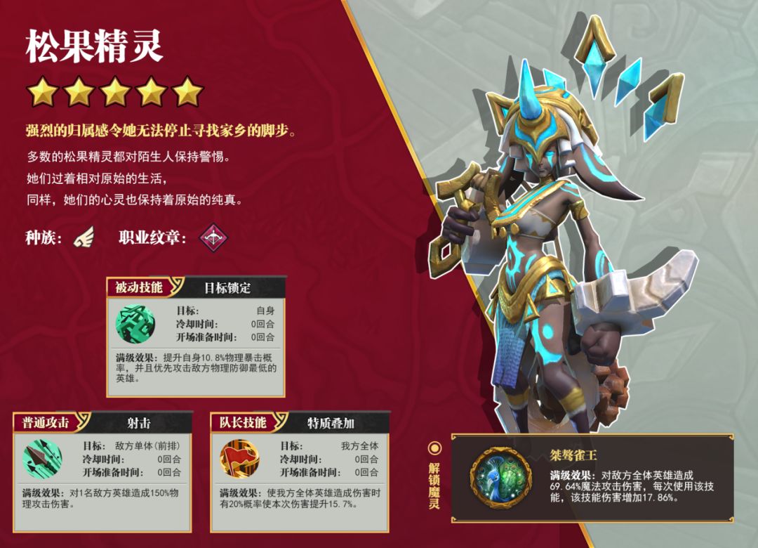 松果精灵在攻击和灵巧上非常突出,无论是初始值还是成长值都是很优秀的存在。因此出手快输出高,尤其对战慢速的兽人队伍时,优势更大!但是在精神和坚韧上比较脆皮,需要有坚挺的前排站住,才能发挥更大的作用!