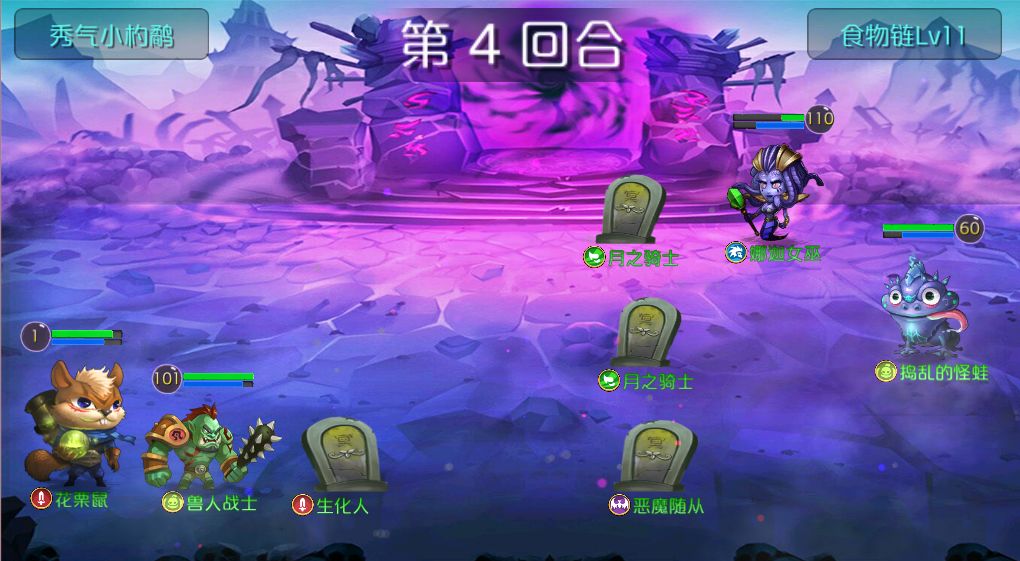 本宝宝在这里小卡了1局,不幸战败。居然不能躺着过,激发了我的斗志。原来是地方人多欺少,这个阵容的攻克点显然是3号【恶魔随从】了,恶魔随从可以起死回生,不先干掉打【月之骑士】也是白搭,且看地方并无一列群攻技能的生物,于是果断调整【布阵】将我方小3傻调到与【恶魔随从】一排的位置,这样可以集中火力,一人摸一下,干死【恶魔随从】。接下来就分分钟恁死其他几个啦!