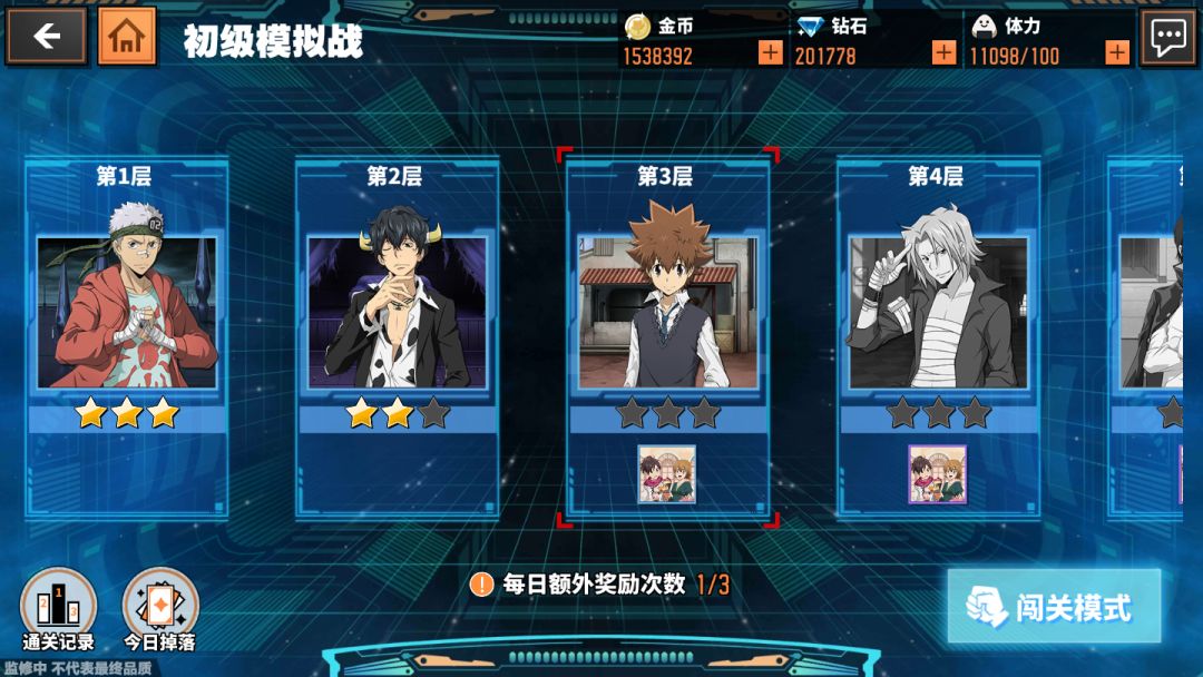 关卡奖励中,除了每一关卡通关之后会有固定星级的辅助卡奖励之外,还会附带掉落有其他星级&效果的辅助卡哟,不仅如此,初级和中级的训练课程、金币等其他道具也会在通关后获得哒!需要注意的是,固定星级的辅助卡只会在首次通关此层时掉落,如果重复闯关,只会获得随机星级&效果的辅助卡以及训练课程哦!为了让玩家获得更多合适好用的辅助卡,在初级模拟战中我们还设定了每日额外奖励,每天会有三次通关后获得额外的随机辅助卡奖励。