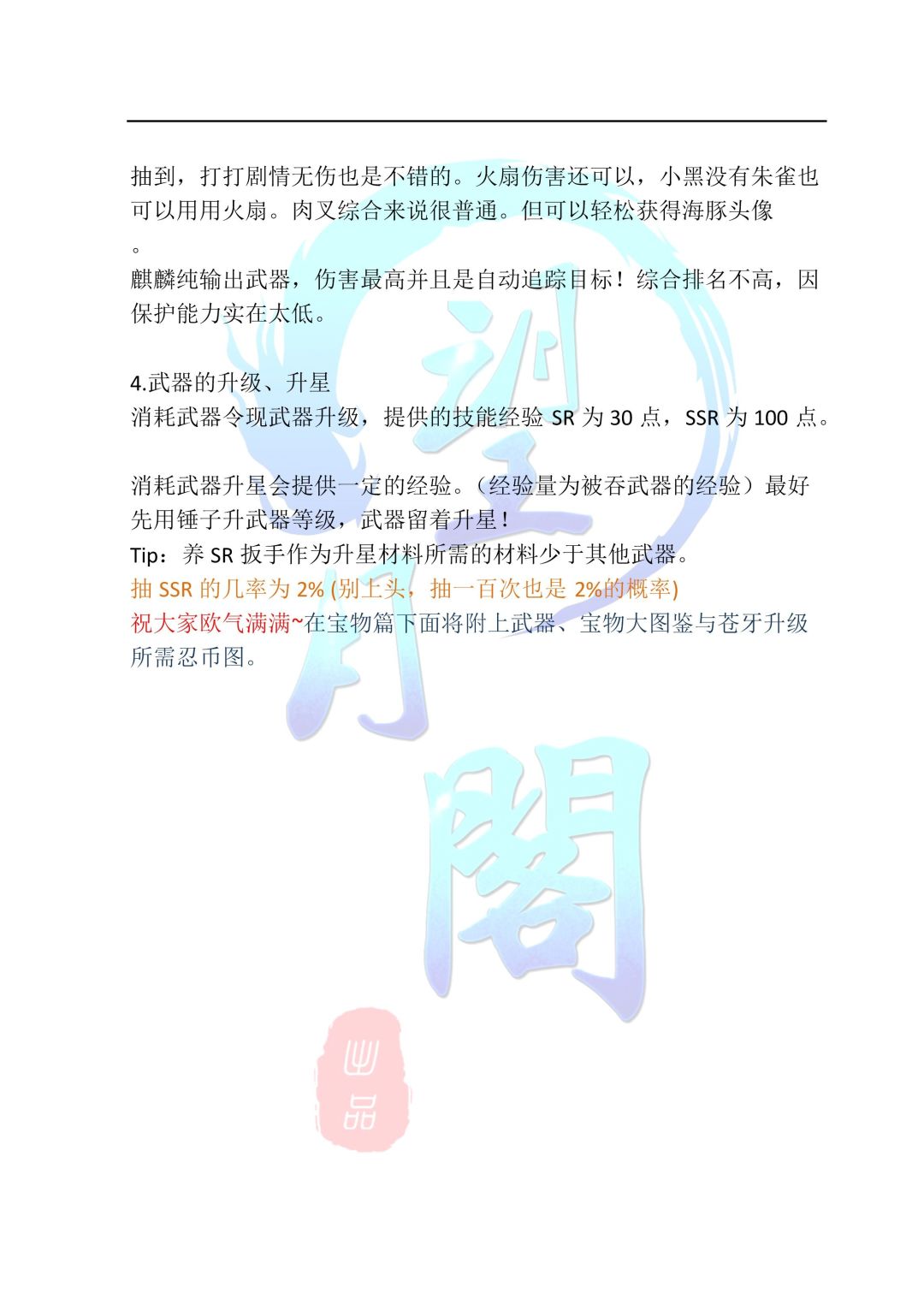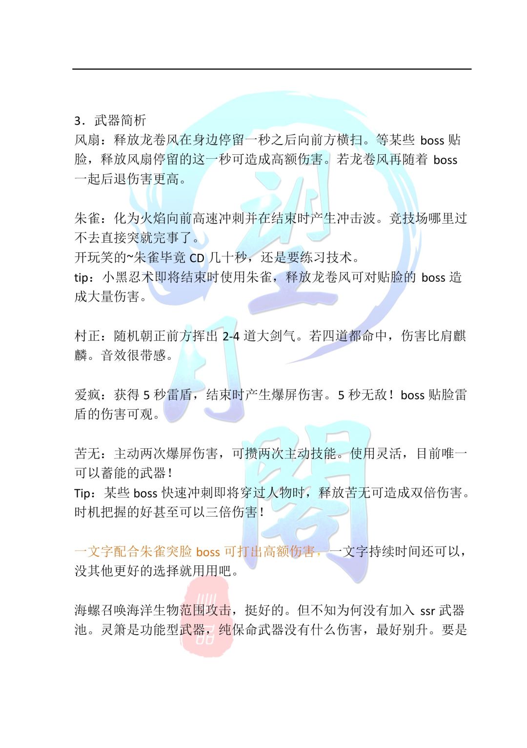 个人认为,苦无/风扇是四人物通用武器。苍牙最好的主武是风扇/村正/苦无。小黑朱雀,其次火扇。琳苦无,其次海螺。阿力一文字/麒麟。副武器看个人喜好,我喜欢偏保命型副武。(一文字/苦无/海螺)主武器最好是契合人物属性,有天赋加成,没有就算了,有影响但得接受。--朱雀现版本被平衡了。撞墙就停下来,但相对还是蛮强的。有具体问题问官方吧)