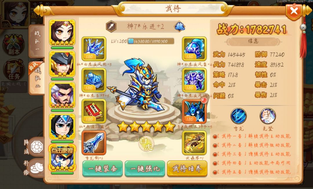 乐进最低80000的速度(打徐庶诸葛吕布要求86000)徐庶貂蝉,左慈,孙策,祝融一律用白马,很简单,首先乐进刷脸开局,冻住三个4个就能开了,接下来不要着急着砍人,站得住脚才行,但求稳不求狠,因为没有诸葛,所以我拉人比较麻烦,用还魂丹拉人,注意这里有一个备用武将,王朗,至少4星。
