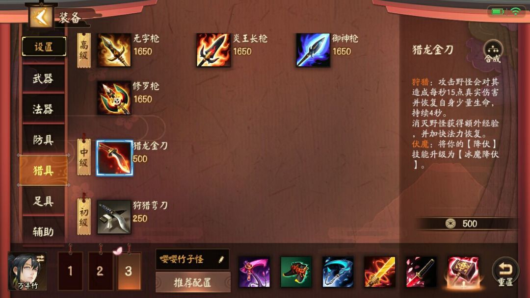 出装如下,走打野路线,前期出完猎龙金刀后出前五件装备,最后在钱够的时候卖掉打野刀改锤子,锤子的作用很大,特别是在队面中是荒,雪女。辅助是山兔,兵俑的时候