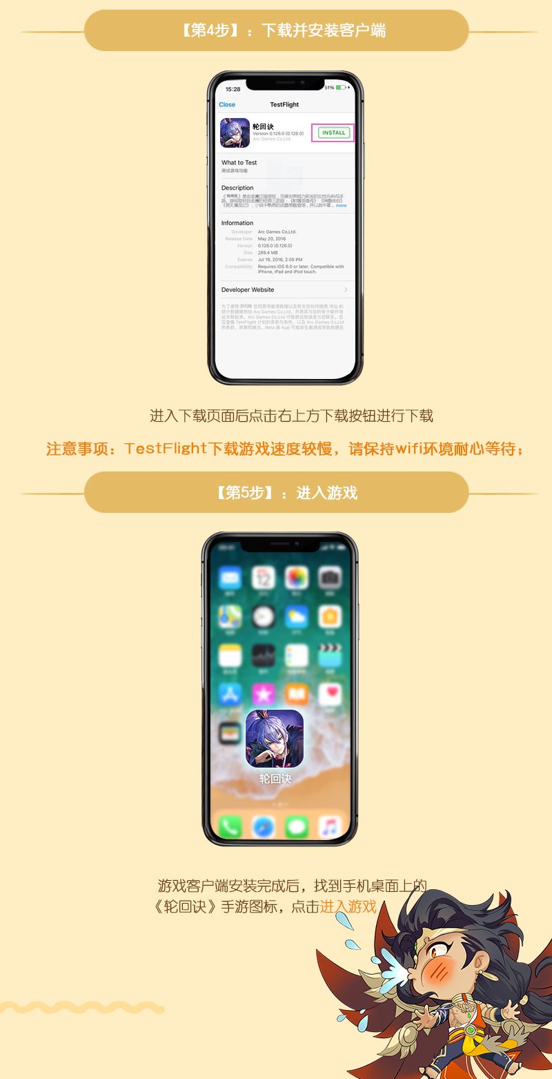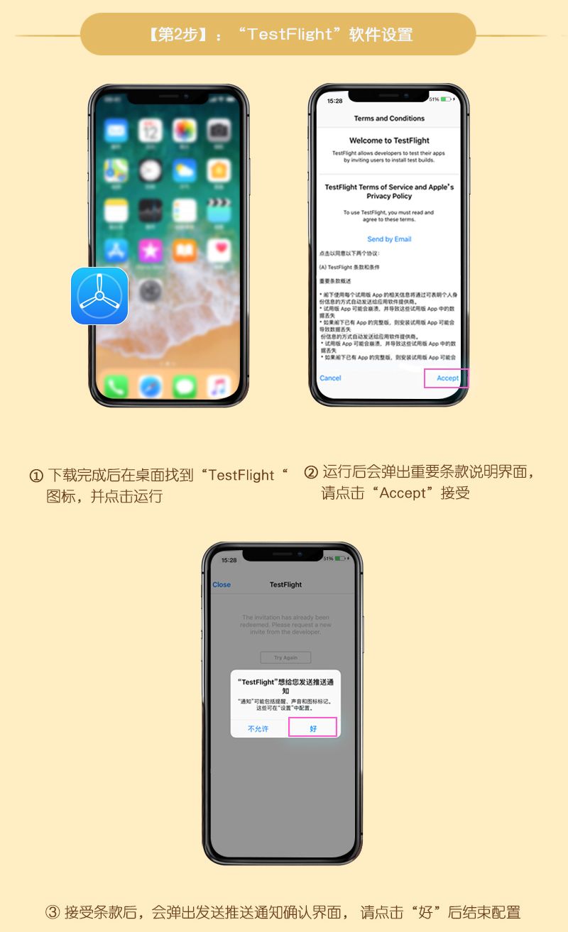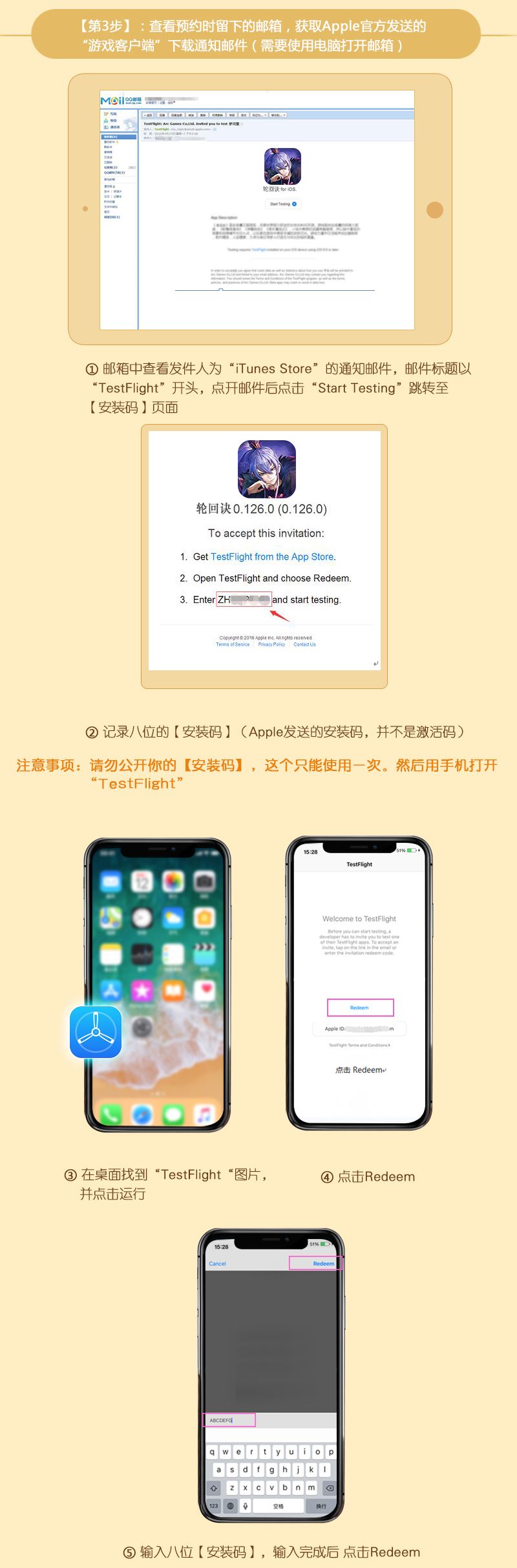 本次测试客户端下邀请,将以邮件的形式发放,请您注意查看自己预约时填写的邮箱,注意查收“Testflight”开头的邀请邮件,收到邀请邮件后请按照下方iOS安装攻略图进行操作!