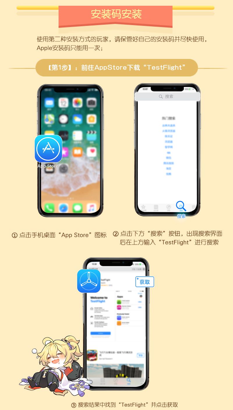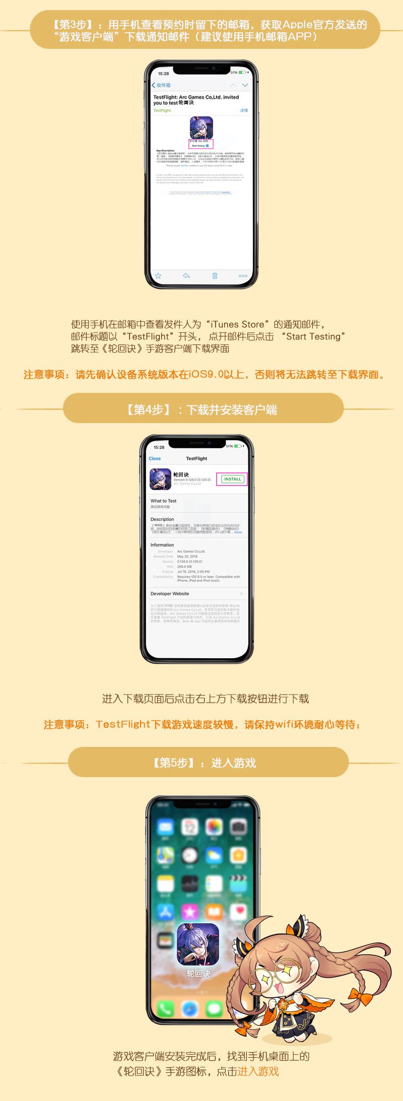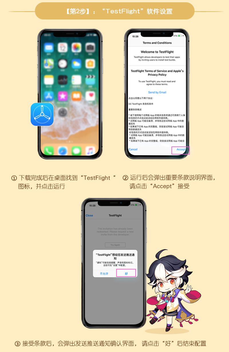 本次测试客户端下邀请,将以邮件的形式发放,请您注意查看自己预约时填写的邮箱,注意查收“Testflight”开头的邀请邮件,收到邀请邮件后请按照下方iOS安装攻略图进行操作!