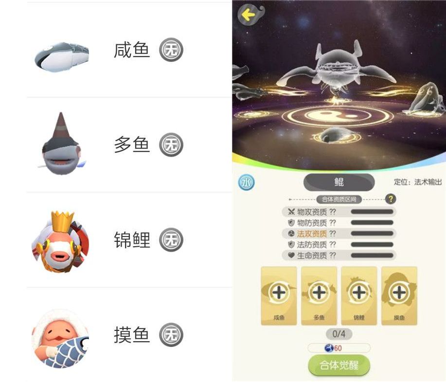咸鱼、多鱼、锦鲤、摸鱼升级到十级,然后开启合体召唤,召唤需要60个碎片(捕捉四种妖灵获得的碎片都是鲲碎片)。有趣的是,鲲的资质与四个妖灵的资质是息息相关的~比如四个妖灵的法攻最低是15,最高是26,那么鲲的法攻资质就是15—26中随机生成~